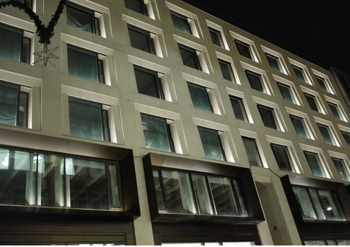 Über der hohen Schaufensterfront im Erdgeschoss sind 4 Fensterleibungen (frames) aus Bronze eingelassen, deren Ausschnitt sich zur Strasse hin öffnet. Die Fensterfront der Geschosse 3 bis 6 besteht aus weißem Jura Kalkstein. Es galt also eine Lichtfarbe zu finden, die mit beiden Materialien gut korrespondiert.