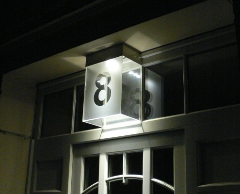 Die „Laterne“ besteht aus 5 klaren Acrylgläsern, wobei die zur Straße zeigende Scheibe mit Edgeglasfolie bestückt ist, aus der die Hausnummer ausgeschnitten wurde. In dem Kopfteil aus Aluminium sitzt eine 6W-LED mit 35° Abstrahlwinkel, die durch das Türfenster auch Teile des Eingangflurs beleuchtet.