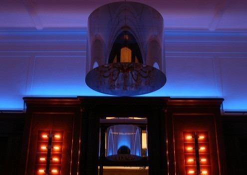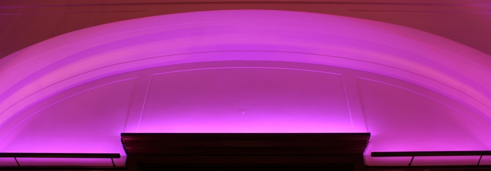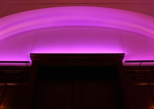 Realisierung: Das pulverbeschichtete Alu-Profil wurde durch feine Röhrchen von der Holzvertäfelung abgehoben. In das Profil eingebettet und zu 4 Schaltkreisen verbunden wurden die 30m RGB-Strips PF12-RGB installiert. Die Farbgebung wird durch die auf Funkbasis arbeitende Fernsteuerung WCM-305-24-Funk, die die Definition von festen Farben erlaubt. Die Farben können in Szenerien mit frei definierbaren Intervallen abgerufen werden.
