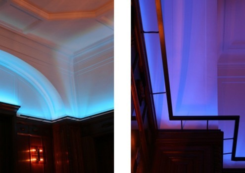 Die Aufgabenstellung für LuzLicht bestand darin, die Eingangshalle der denkmalgeschützten Patrizier-Villa (seit 1990 denkmalgeschützt ) filigran und unaufdringlich durch LEDs in Farbe zu tauchen. Dabei musste der Aufbau der Voute mit der Holzvertäfelung und der übrigen Beleuchtung korrespondieren.