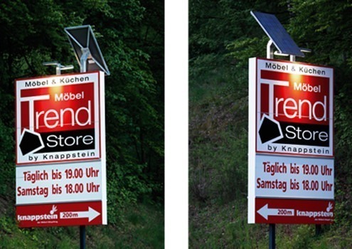 Möbel „Knappstein“ ist im Sauerland eine Institution. In Lennestadt-Elspe steht am Ortseingang ein Werbeschild von der Größe 220 x 240 cm. Dieses Schild war bislang wegen fehlendem Netzstrom unbeleuchtet und hatte gerade in der dunklen Jahreszeit wenig Werbewirksamkeit.