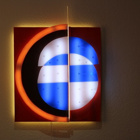 • Entdecken Sie eine moderne Lichtplastik, die das Logo abstrakt interpretiert. Das Kunstwerk besteht aus einem Holz-Unterbau und mehreren Acrylglas-Scheiben, die mit weißen LEDs hinterleuchtet werden. Ideal für zeitgenössische Innenräume, Galerien und lichtbasierte Kunstinstallationen.LuzLicht