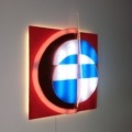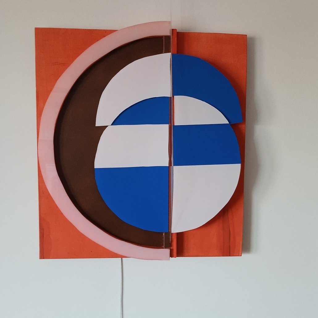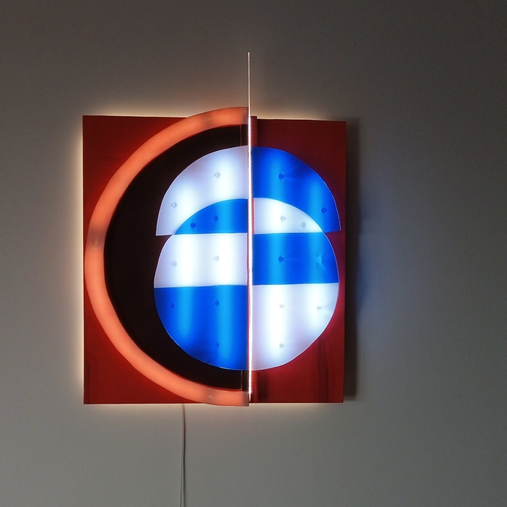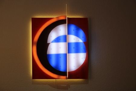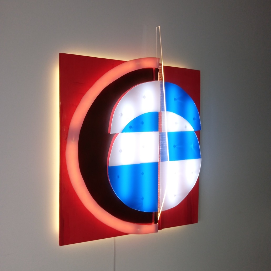 Im Zentrum steht ein segmentiertes Kreis- und Linienmotiv, das in Kombination mit warmweißem Licht und partiellen blauen Akzenten eine lebendige Dynamik erzeugt. Die vertikale Teilung der Lichtfläche verstärkt den abstrakten Charakter der Arbeit und macht „Alois“ zu einem modernen Kunstobjekt, das sowohl stilistisch als auch atmosphärisch beeindruckt.