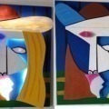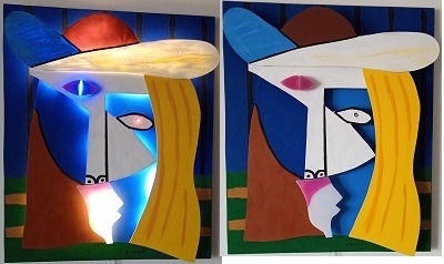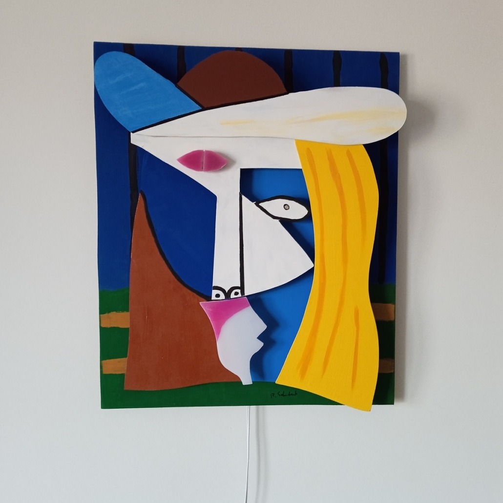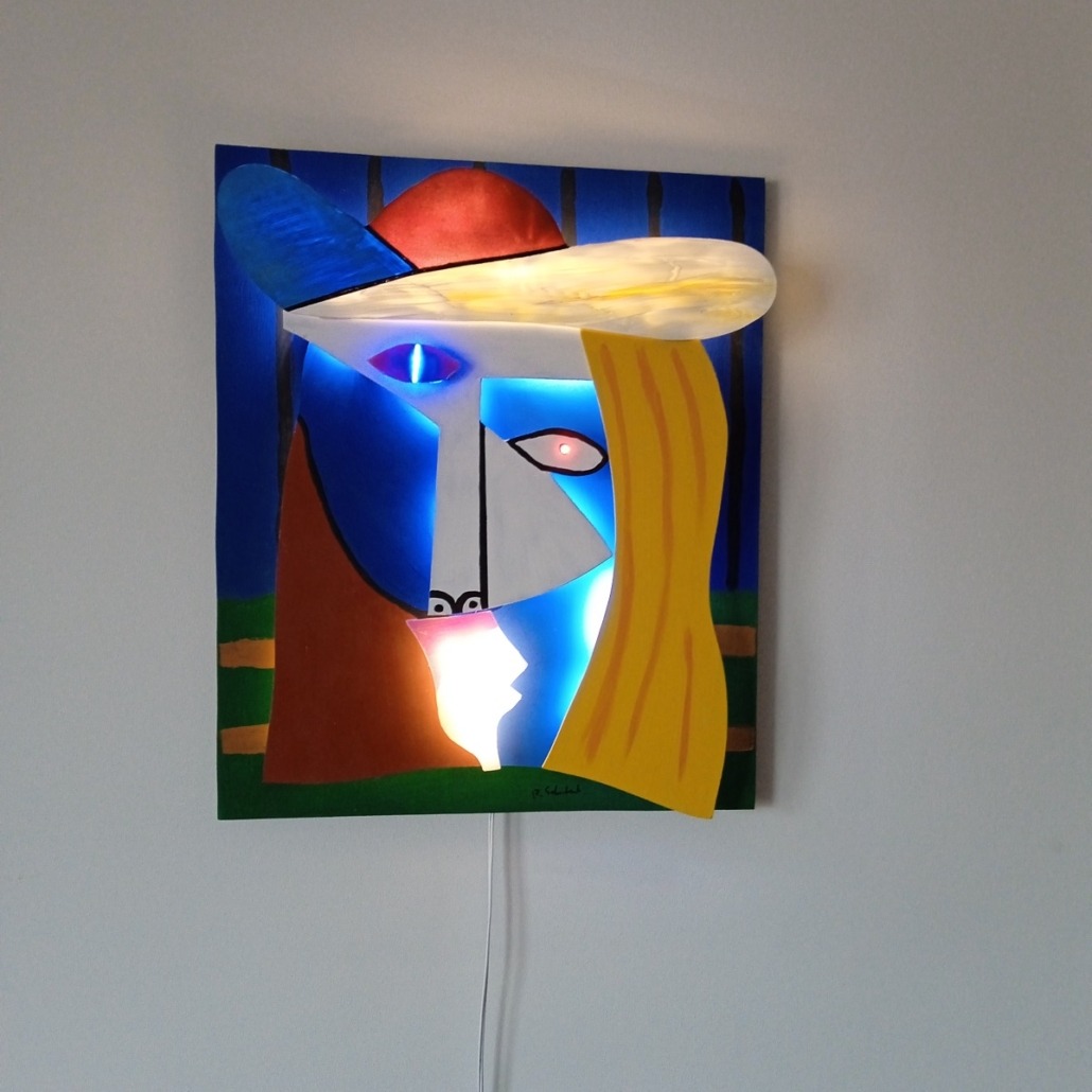 im Stile von Pablo Picasso. 3D-Plastik aus Holz und Plexiglas, dimmbar, mit intensivem, surrealem Gesichtsausdruck. Ideal für repräsentative und moderne Räume. Handgefertigt, Lieferzeit ca. 14 Tage.