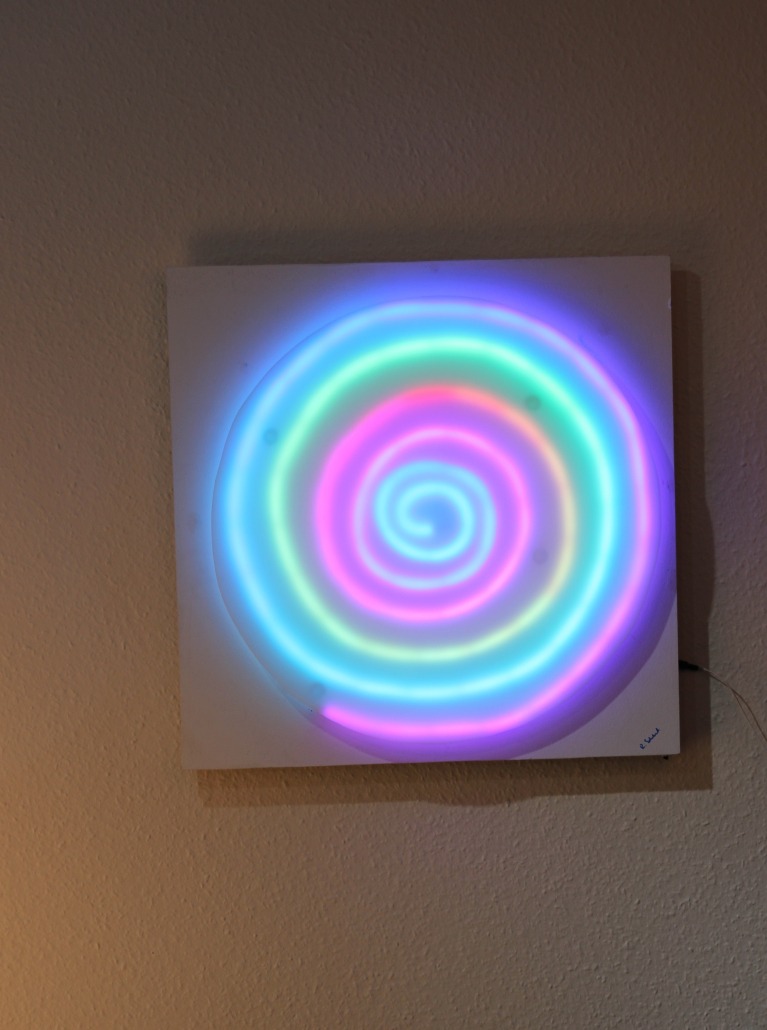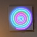 Runde Mandala-Leuchte mit sanftem Farbverlauf. Ideal für Meditation, Empfang & Wohnräume. Edler Holz-Unterbau, RGB-LED, 62 × 62 cm.