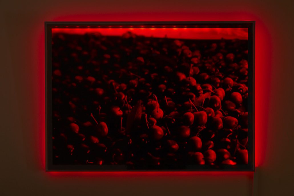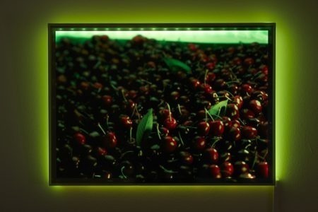 Die Plastik „Moving target Kirschen“ besteht aus einem Acrylglas-Rahmen mit einemn Double-Layer Foto, dem auf der Rückseite pixelgenau gespiegelt das gleiche Objekt aufgetragen wurde. Die dadurch entstehende Tiefe hebt die Hinterleuchtung hervor, die durch das Farbspektrum läuft. Das Bild scheint in Bewegung, weil immer unterschiedlich farbige Früchte von der Hinterleuchtung hervorgehoben werden. Die Farbsteuerung kann von schnell (Farbwechsel < 1 sec) bis langsam (Farbwechsel > 1 min) eingestellt werden.
