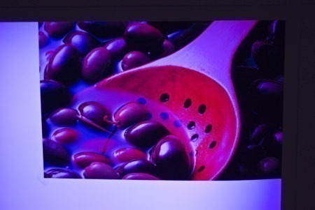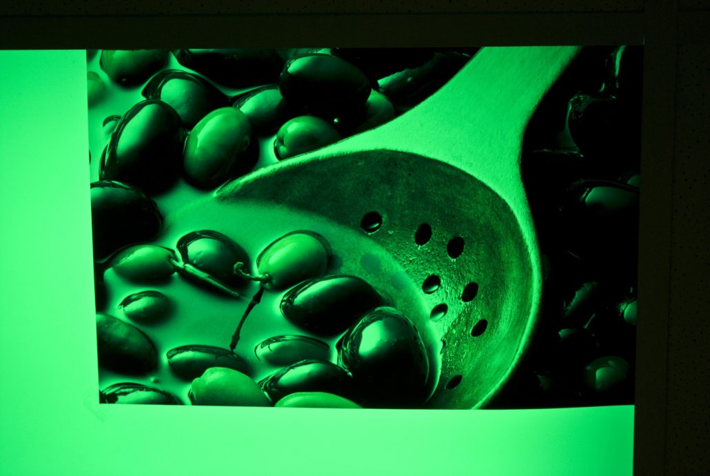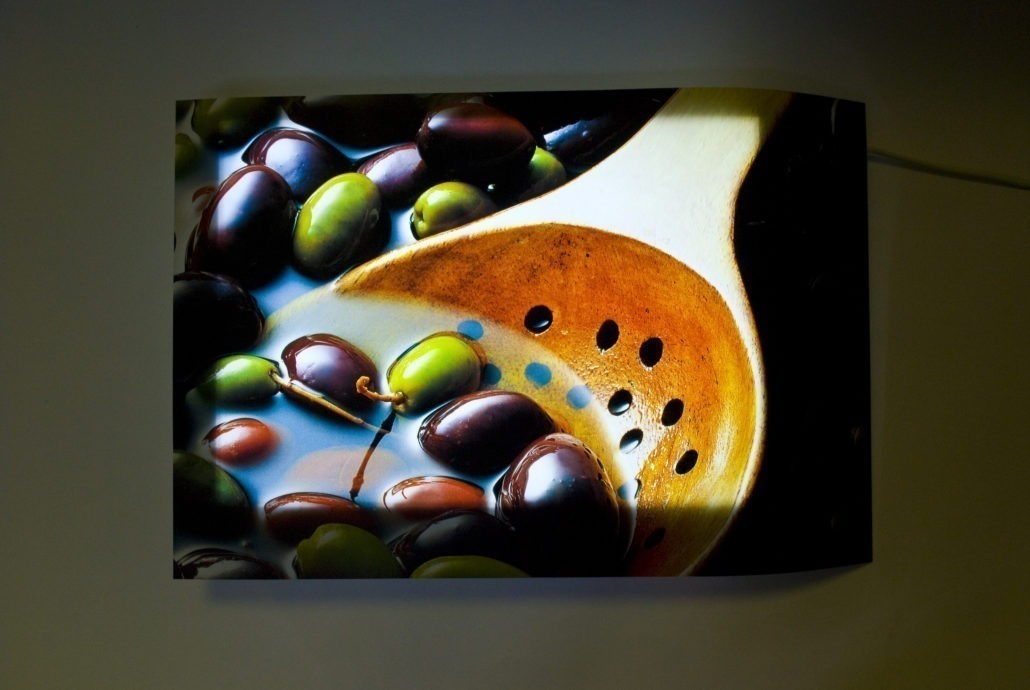 Die Plastik „Moving target Oliven“ besteht aus einem Acrylglas-Rahmen mit einemn Double-Layer Foto, dem auf der Rückseite pixelgenau gespiegelt das gleiche Objekt aufgetragen wurde. Die dadurch entstehende Tiefe hebt die Hinterleuchtung hervor, die durch das Farbspektrum läuft. Das Bild scheint in Bewegung, weil immer unterschiedlich farbige Früchte von der Hinterleuchtung hervorgehoben werden. Die Farbsteuerung kann von schnell (Farbwechsel < 1 sec) bis langsam (Farbwechsel > 1 min) eingestellt werden.